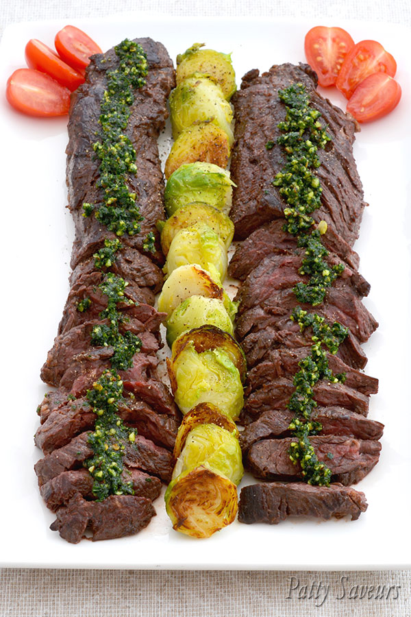 Pour cette recette, j’ai servi deux onglets de boeuf pour 3 personnes, simplement grillés à la poêle, servis avec un pesto de persil maison piquant style chimichurri et quelques choux de Bruxelles.